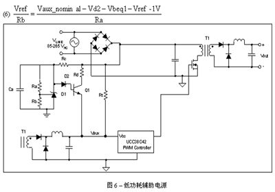 通过电阻器Rd的Ra以及二极管D1、D2,再加上晶体管Q1,它们构成了低功耗偏置电源。低功耗偏置电源根据设置可调节电压,使其高于PWM的关闭电压,又低于辅助绕组的额定电压(Vaux_nominal)。这就使晶体管Q1能作为二极管或电路发挥作用。如果PWM由辅助绕组供电,那么Vaux电压将反向偏置,关闭晶体管Q1而节约能量。如果由于能量不足Vaux电压下降,那么Q1就会变成正向偏置,以向PWM控制器提供必需的能量。